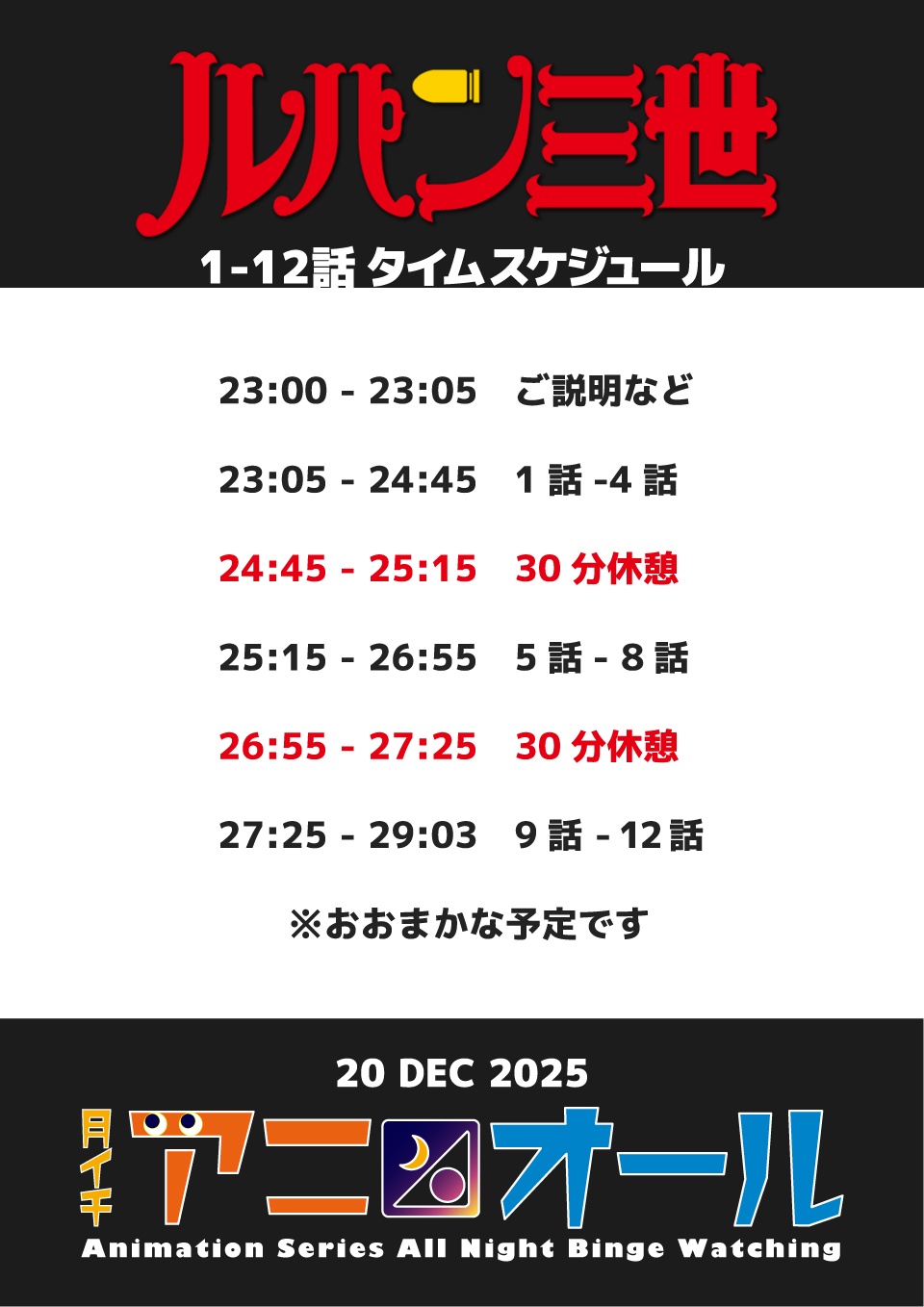 2025年12月はもう1本、放送55周年を迎える「ルパン三世 PART1」の新規デジタルリマスター版の初お披露目を1月10日(土)と二夜にわけて全話上映。