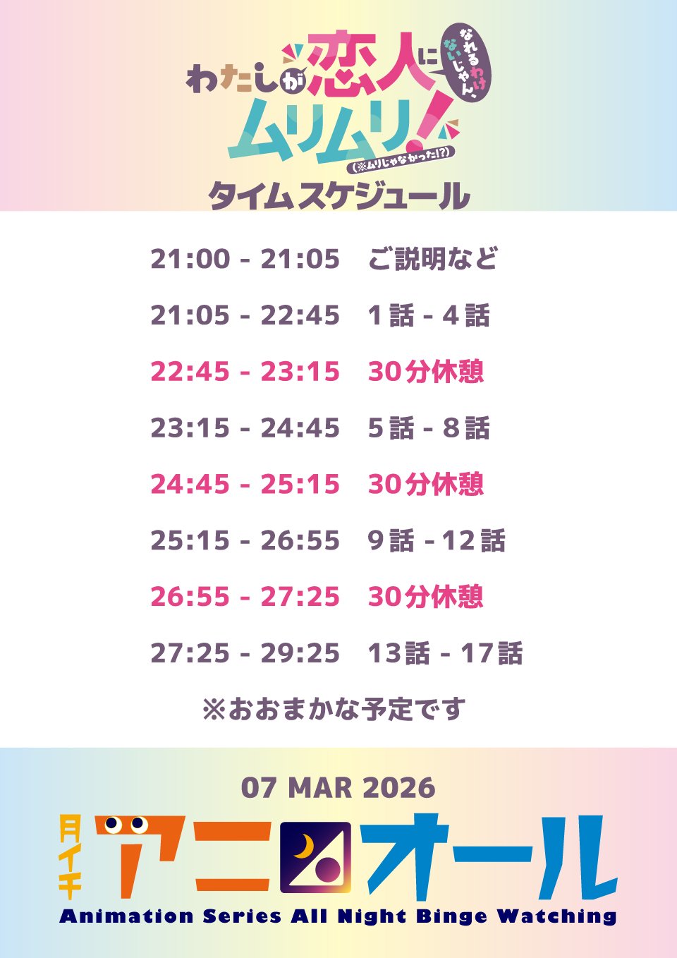 2026年3月は、2025年夏クールに全12話が放送され話題を呼び、その続編となる13話~17話の特別編集版を劇場上映した「わたしが恋人になれるわけないじゃん、ムリムリ!(※ムリじゃなかった!?)」を17話全話。